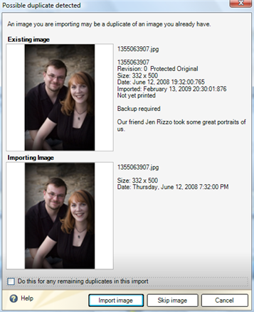 | Do this for any remaining duplicates in this import | Click this checkbox to apply your setting to all of the images in this import. For example, if you click the checkbox then click Skip image, all duplicate images will be skipped (and therefore not imported). |